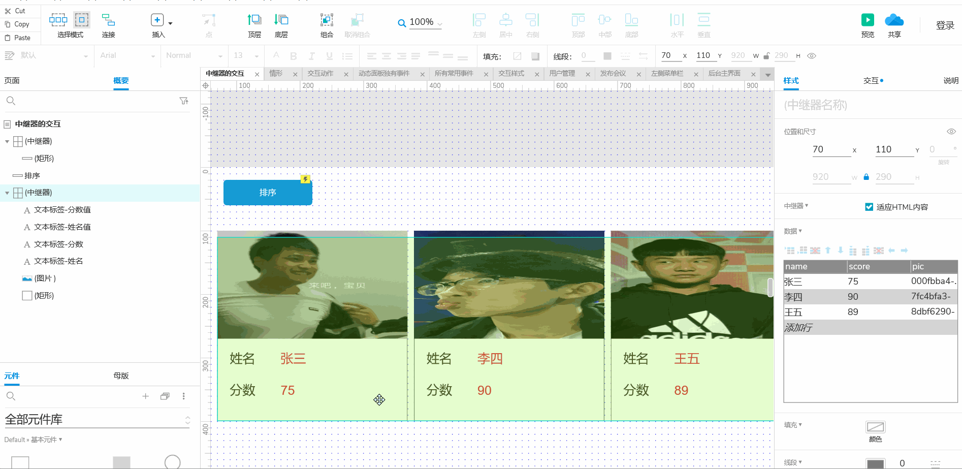 添加完列和值后,可以自行选择元件绑定它们,有多少行列就复制多少行列的元件,但值不同。也可以对中继器中的值进行排序。