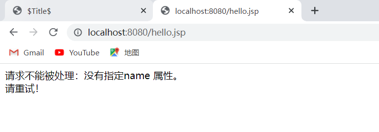 这说明没有提供name参数,hello.jsp页面中抛出RuntimeException异常,所以调用错误页面。