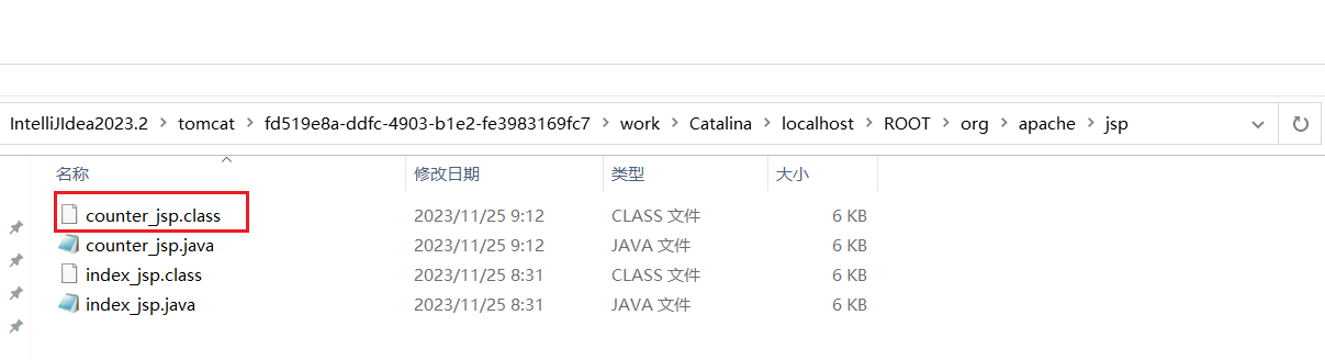 对应的类文件在下图中框住的(using catalina_base:表示Tomcat实例运行时的根目录)路径下的work文件夹中可以找到