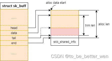 从函数实现可以看出,skb_trim是__skb_trim的封装,作用是将skb的负载数据长度修剪为len,并修剪长度是通过修改skb->tail的指针来实现的。示意图如下: