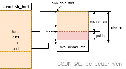 从函数实现可知,skb_put函数将skb->tail加了len,表示将skb的实际负载数据的长度加len,要实现这一点,alloc_skb分配的len减去skb_reserve的len应该要大于等于skb_put的len,这样才能保证skb_put函数运行没问题。示意图如下: