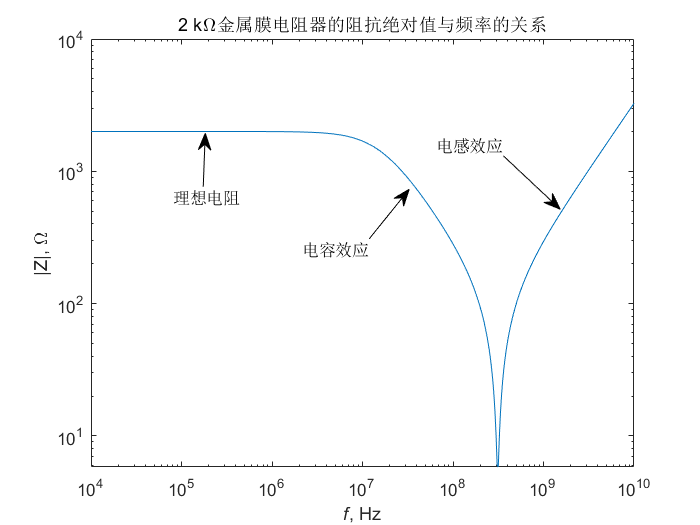 例:长2.5cm,AWG26铜线(半径0.2032mm)连接的2K金属薄膜电阻的高频阻抗特性,其中寄生电容