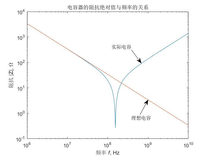 例:计算一个47pF电容器的高频阻抗,电容器的电介质为,其损耗角正切为