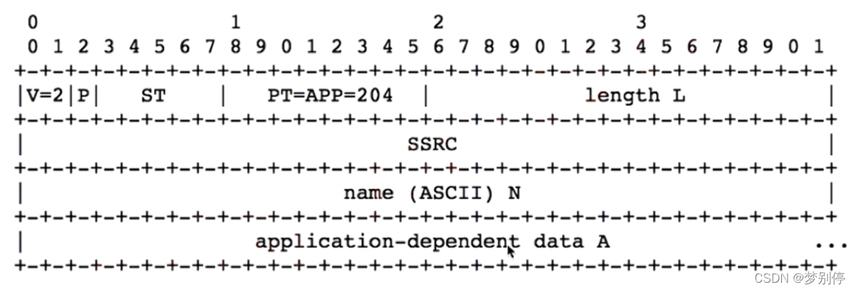 该报文用于应用自定义消息类型,PT = 204,ST 表示自定义消息子类型,name 表示自定义消息名字,data 表示消息携带的数据。