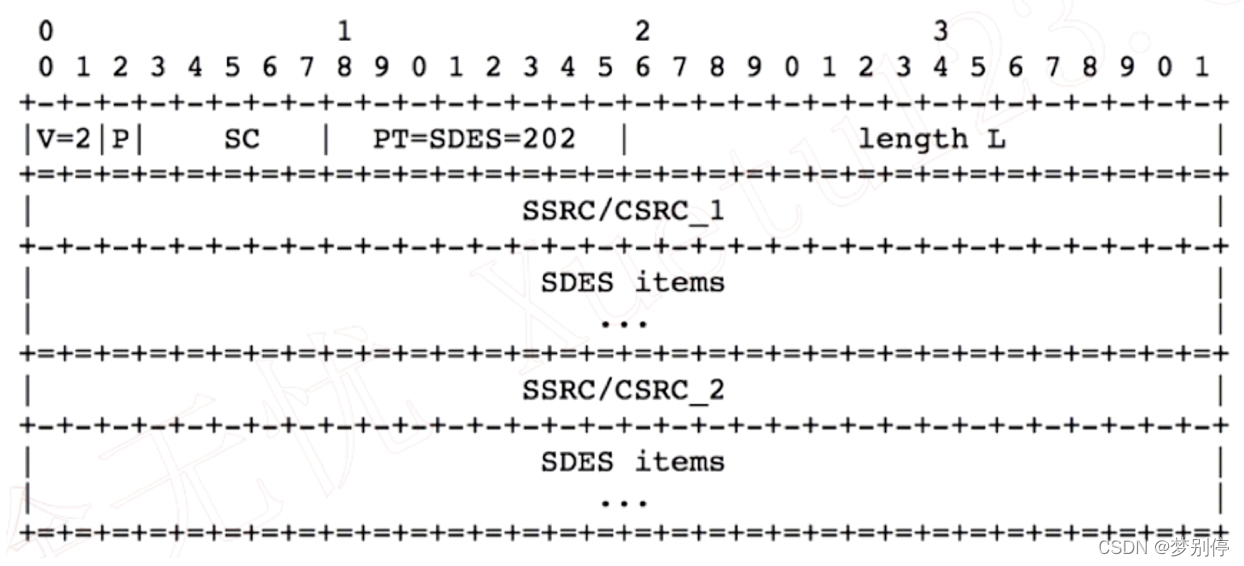 该报文用于描述 SSRC 信息,PT = 202,SC 表示描述的 SSRC SDES 个数,SDES items 是TLV 格式数。