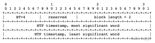 RRT (Receiver Reference Time) 报告块格式如上,主要包含发送该报告块的 NTP 时间,发送该报告块主要用于接收端结合 DLRR 报告块测算 RTT 时间。