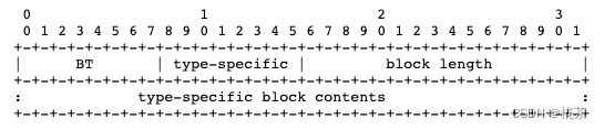 report block 构成如上所示,BT 指示该 block 的类型,block 有 7 种类型,分别是 LRLE(BT=1),DRLE(BT=2),PRT(BT=3),RRT(BT=4),DLRR(BT=5),SS(BT=6),VM(BT=7),block length 指示块长度,以及跟 BT 类型相关的特定含义的字段,比较常用的有 RRT 和 DLRR。