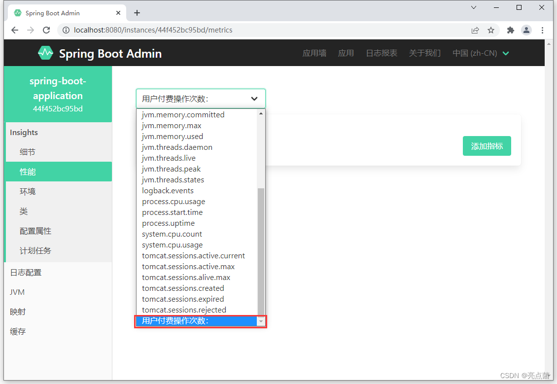 metrics端点描述了性能指标,除了系统自带的监控性能指标,还可以自定义性能指标。
