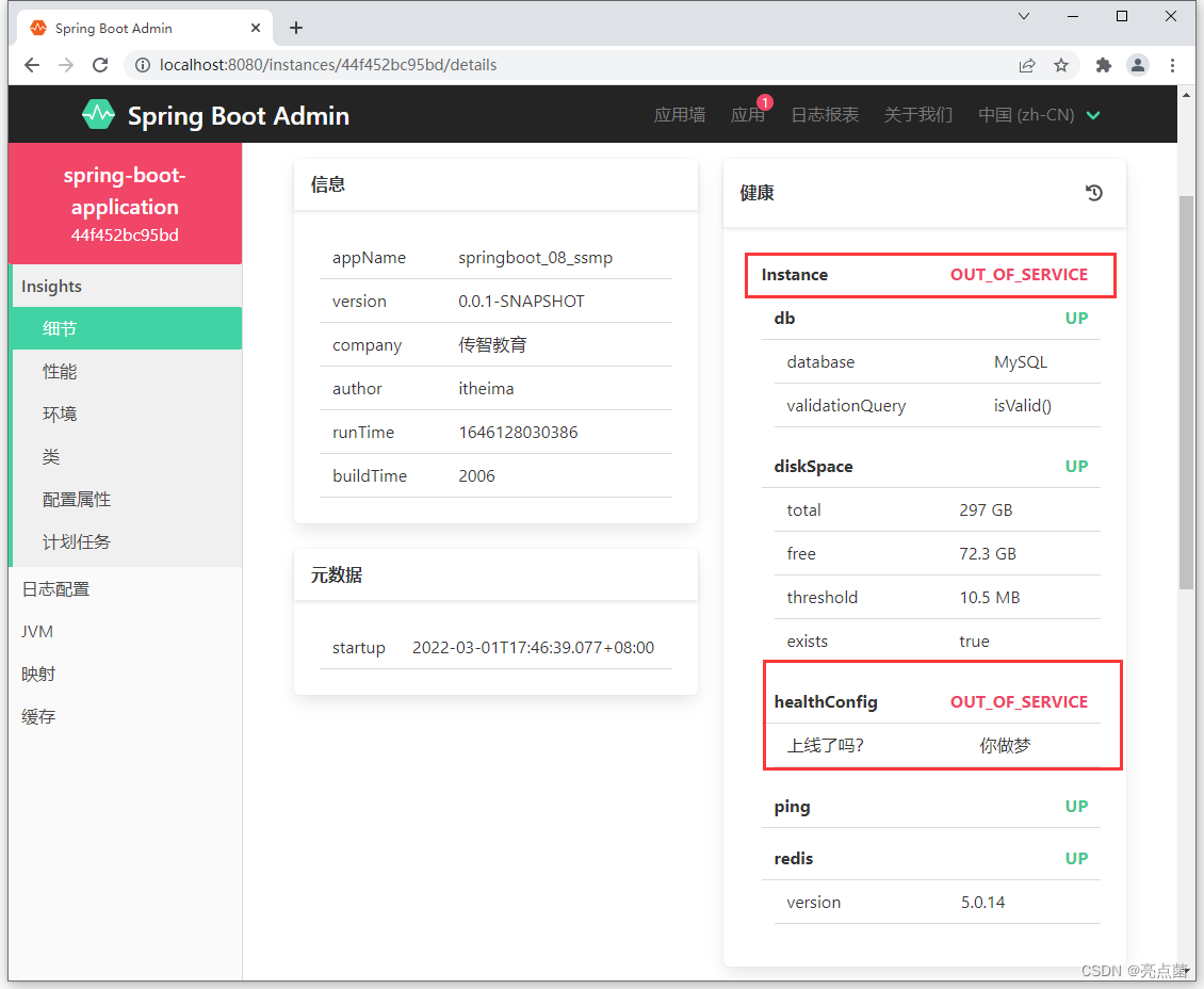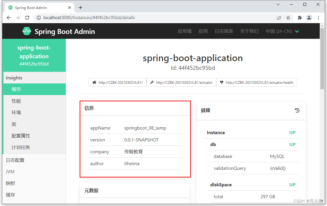 info: appName: @project.artifactId@ version: @project.version@ company: 传智教育 author: itheima配置完毕后,对应信息显示在监控平台上