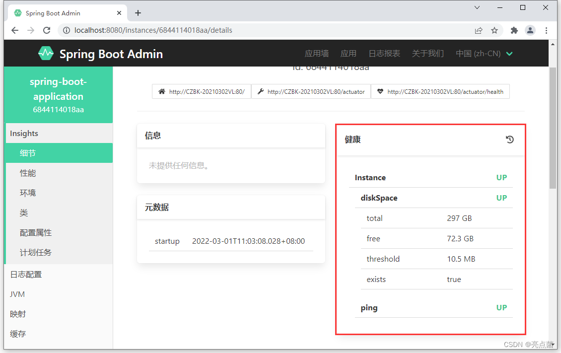 上述配置对于初学者来说比较容易混淆。简单解释一下,到下一节再做具体的讲解。springbootadmin的客户端默认开放了13组信息给服务器,但是这些信息除了一个之外,其他的信息都不让通过HTTP请求查看。所以你看到的信息基本上就没什么内容了,只能看到一个内容,就是下面的健康信息。