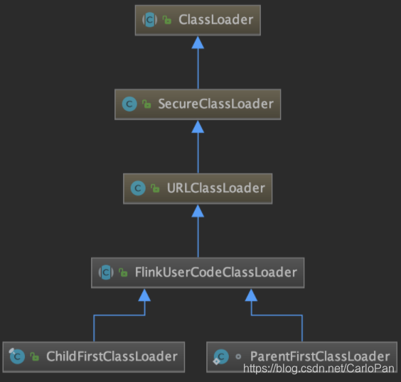 FlinkUserCodeClassLoader继承自URLClassLoader。因为Flink App的用户代码在运行期才能确定,所以通过URL在JAR包内寻找全限定名对应的类是比较合适的。而ParentFirstClassLoader仅仅是一个继承FlinkUserCodeClassLoader的空类而已。