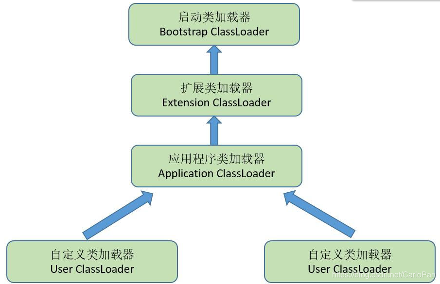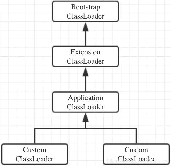 这样就相当于ParentFirstClassLoader直接调用了父加载器的loadClass()方法。之前已经讲过,JVM中类加载器的层次关系和默认loadClass()方法的逻辑由双亲委派模型(parents delegation model)来体现,复习一下含义: