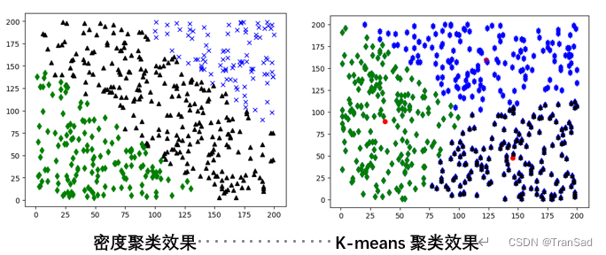 上面左图是密度聚类的实现结果。可见密度聚类算法大致成功地将数据集划分为了三部分。