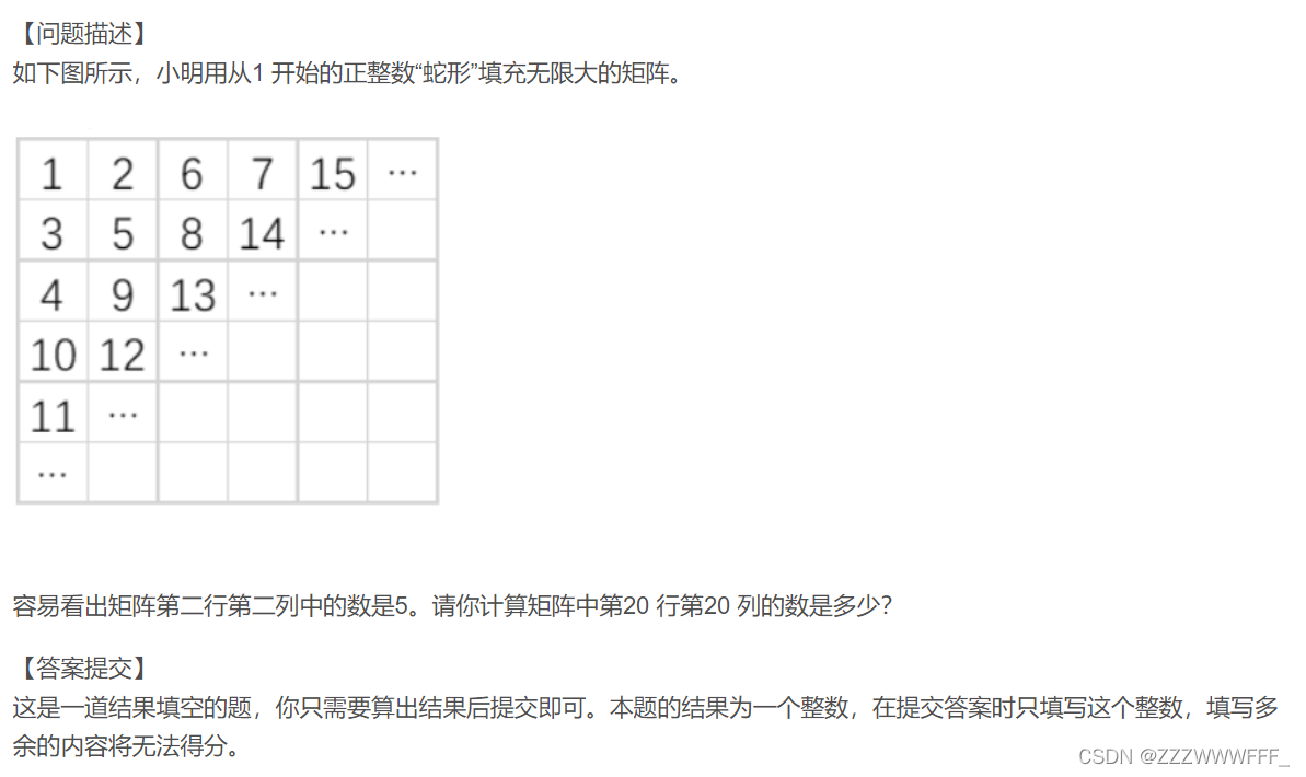 最近在刷蓝桥杯真题时,又做到了曾经我们做过的“蛇形填数”,只不过上次我们做过的是螺旋形的,而这次我们遇到的是三角形的,如下:该题是一道填空题,我一开始的想法主要是想按照“三角形螺旋规则”将数字都填入一个二维数组,最后查找这个数组内的第20行第20列的元素是什么来解决问题不过后来发现这样做有些麻烦,毕竟这是一道填空题也是做着做着发现了规律,我们依次把第一行第一列、第二行第二列、第三行第三列————的