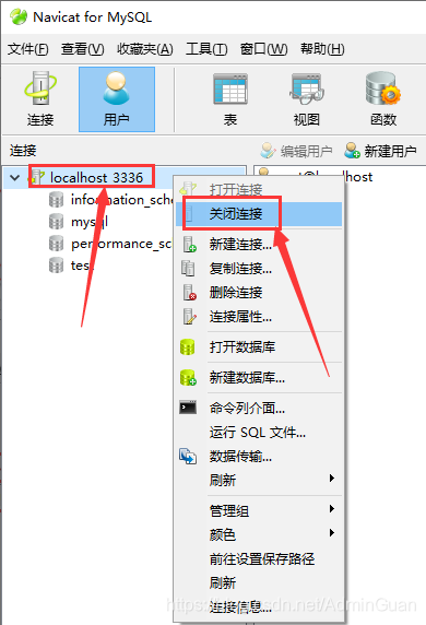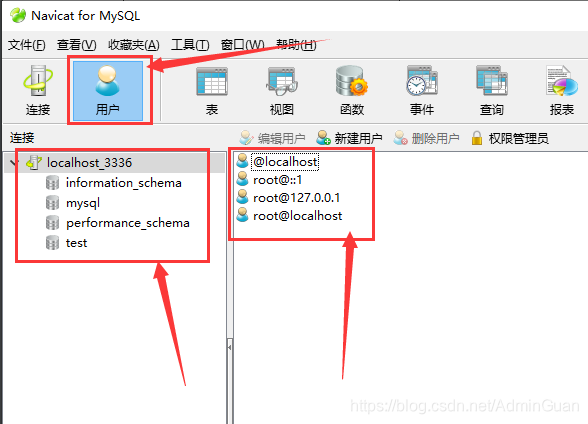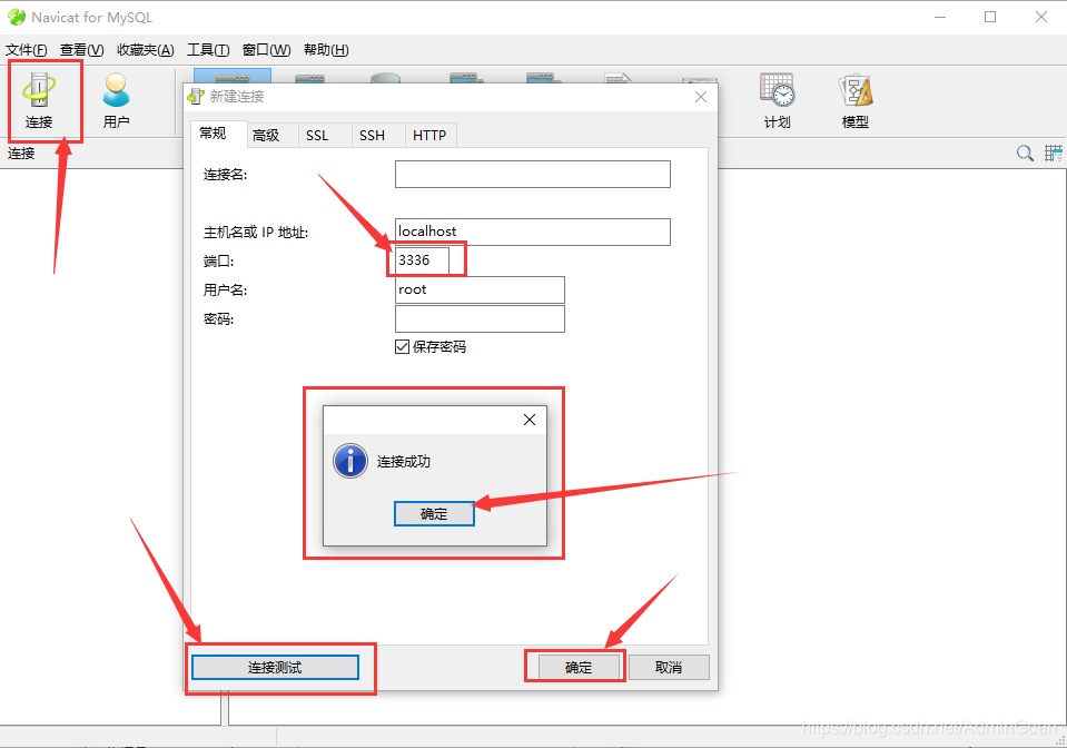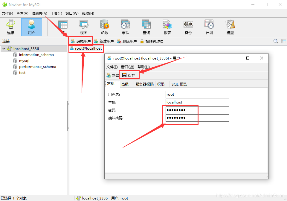 用 navicat 连接数据库,再修改 root 密码【点击连接,端口号输入 my.ini 文件里面配置的端口号,点击连接测试,弹出连接成功则连接 ok 了,双击 localhost_3336 打开数据库,可以看到默认有四个用户,可以删除其他三个用户再编辑用户,修改密码点击保存即可】