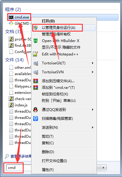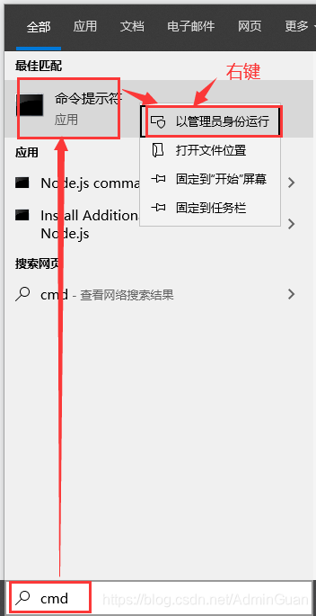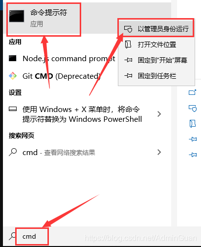 解决办法:搜索输入 cmd,右键选择“以管理员身份运行”
