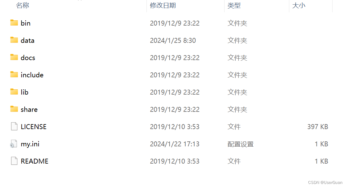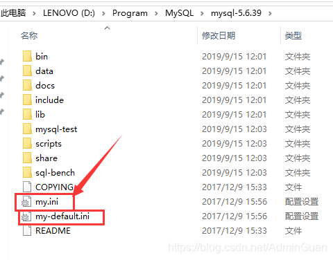 解压下载的 MySQL 压缩包,将根目录下的 my-default.ini 文件复制粘贴一份,重命名为:my.ini