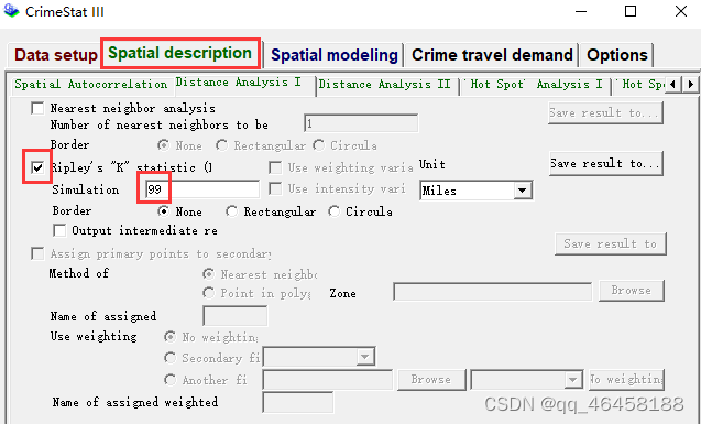 运用地理空间分析软件Crimestat,下载官网:http://www.icpsr.umich.edu/CrimeStat;步骤:选择数据,shp文件(投影坐标的);X、Y坐标匹对;最近邻分析:“Spatial description>>>Distance Analysis I>>>Nearest neighbor analysis” ;多距离空间聚类分析(Ripley's K函数):“Spatial description>>>Distance Analysis I>>>Ripley's K statistic”,Simulation选99. 但该软件出图效果不理想,可复制或下载数据,用excel画图或者python画图也很快。