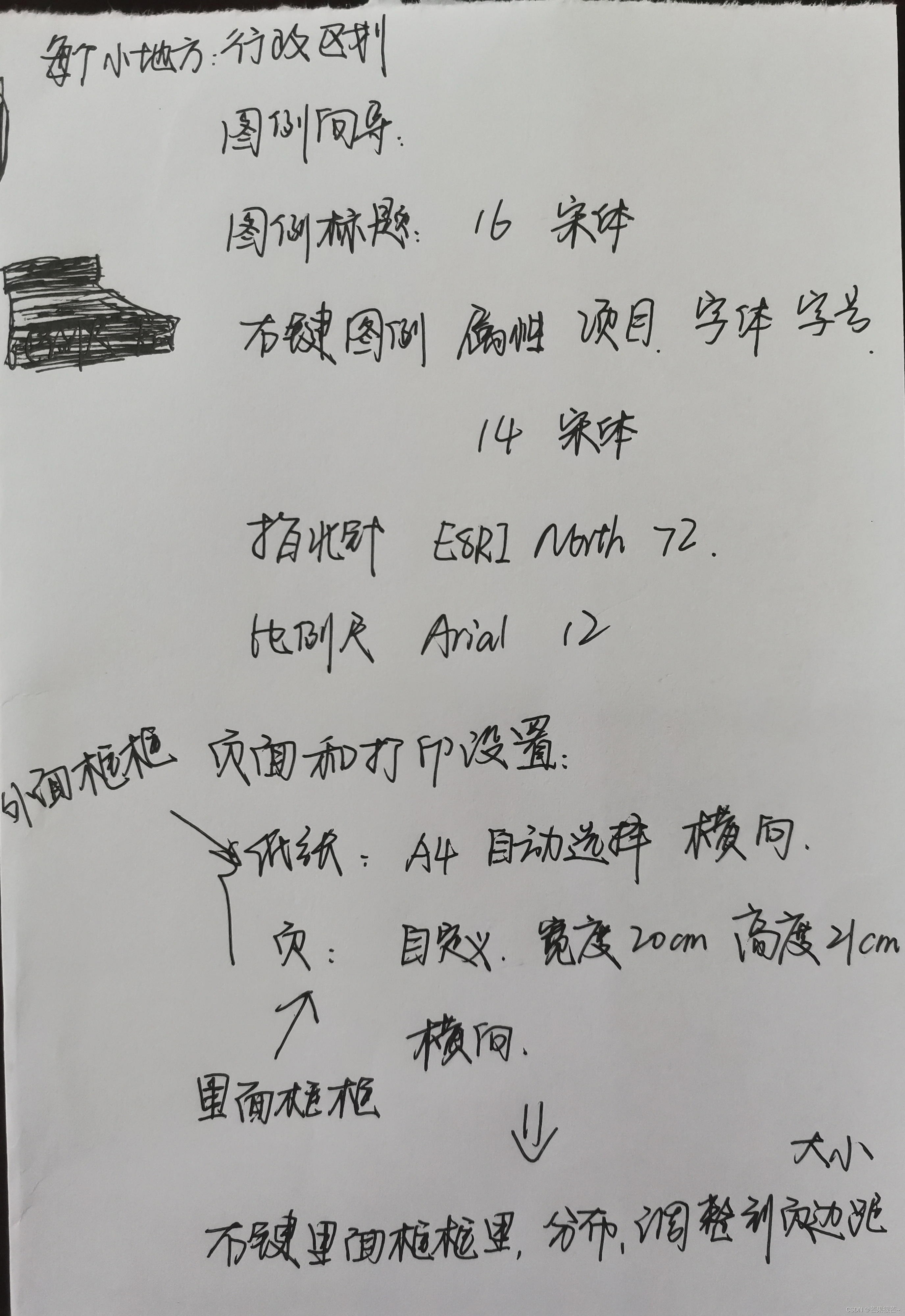 版面设计:空白处右键“页面和打印设置”,设置纸张大小和方向;在数据框空白处右键“分布——调整到页边距大小”、点击放大工具,框选研究区域进行合适的放大(出图时只有数据框中的图像才能显示)