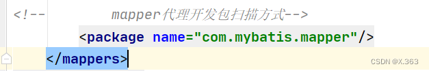 package com.mybatis.pojo; import com.mybatis.mapper.UserMapper; import org.apache.ibatis.io.Resources; import org.apache.ibatis.session.SqlSession; import org.apache.ibatis.session.SqlSessionFactory; import org.apache.ibatis.session.SqlSessionFactoryBuilder; import java.io.IOException; import java.io.InputStream; import java.util.List; public class mybatis2_usermapper { public static void main(String[] args) throws IOException { //1.加载mybatis的核心配置文件,获取sqlsessionFactory String resource = "mybatis-config.xml"; InputStream inputStream = Resources.getResourceAsStream(resource); SqlSessionFactory sqlSessionFactory = new SqlSessionFactoryBuilder().build(inputStream); //2.获取sqlsession对象,用来执行sql SqlSession sqlSession = sqlSessionFactory.openSession(); //3.获取usermapper的代理对象 UserMapper mapper = sqlSession.getMapper(UserMapper.class); List<User> users = mapper.selectALL(); System.out.println(users); //4.释放资源 sqlSession.close(); } }在mybatis-config-xml文件中加载包扫描方式:(替换之前的加载sql映射文件的方法)