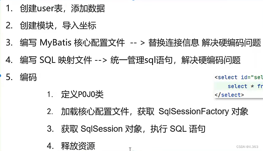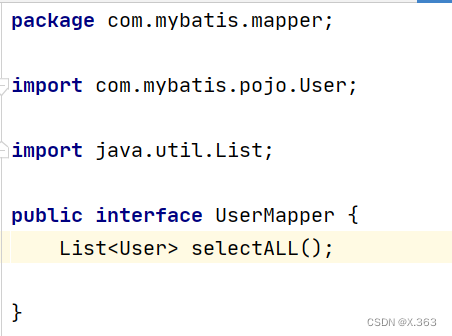 //1.加载mybatis的核心配置文件,获取sqlsessionFactory String resource = "mybatis-config.xml"; InputStream inputStream = Resources.getResourceAsStream(resource); SqlSessionFactory sqlSessionFactory = new SqlSessionFactoryBuilder().build(inputStream); //2.获取sqlsession对象,用来执行sql SqlSession sqlSession = sqlSessionFactory.openSession(); //3.执行sql List<User> users = sqlSession.selectList("test.selectALL"); System.out.println(users); //4.释放资源 sqlSession.close();3、Mapper代理开发:简化原生方式中的硬编码,简化后期执行sql;