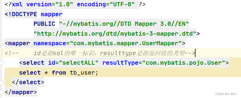 <?xml version="1.0" encoding="UTF-8" ?> <!DOCTYPE mapper PUBLIC "-//mybatis.org//DTD Mapper 3.0//EN" "http://mybatis.org/dtd/mybatis-3-mapper.dtd"> <mapper namespace="test"> <!-- id是指sql的唯一标识,resulttype是指返回值的类型--> <select id="selectALL" resultType="com.mybatis.pojo.User"> select * from tb_user; </select> </mapper>(5)加载user类:传入resulttype返回值位置,namespace为名称空间;
