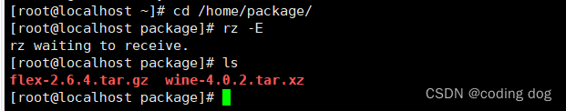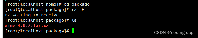 1.2:使用命令cd package,并将交付文件中的wine-4.0.2.tar.xz使用Xshell传入package