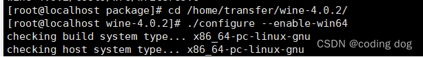 5.1:使用命令cd /home/transfer/wine-4.0.2并执行命令./configure --enable-win64