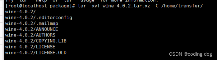 1.3:使用命令tar -xvf wine-4.0.2.tar.xz -C /home/transfer