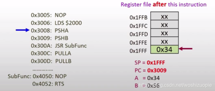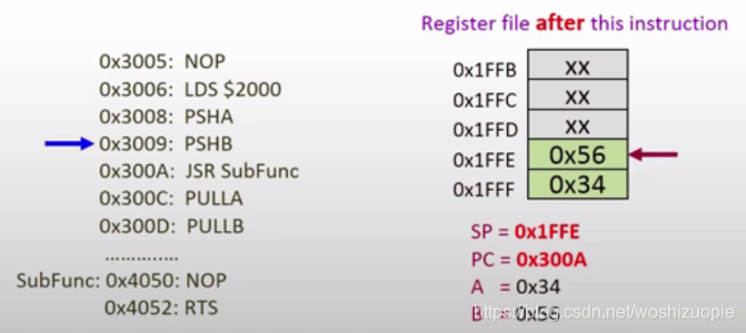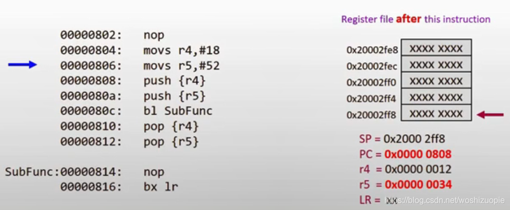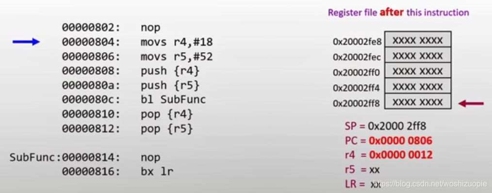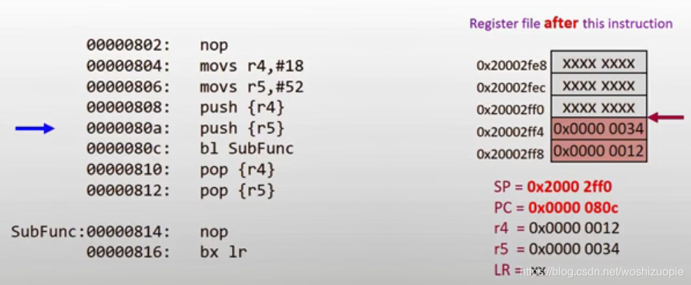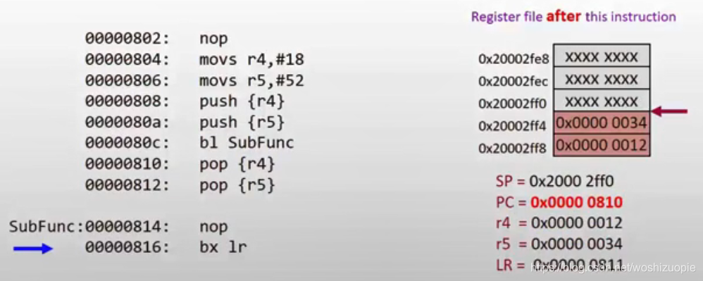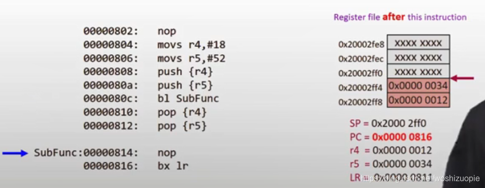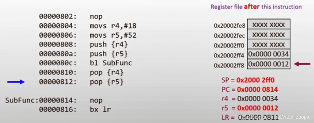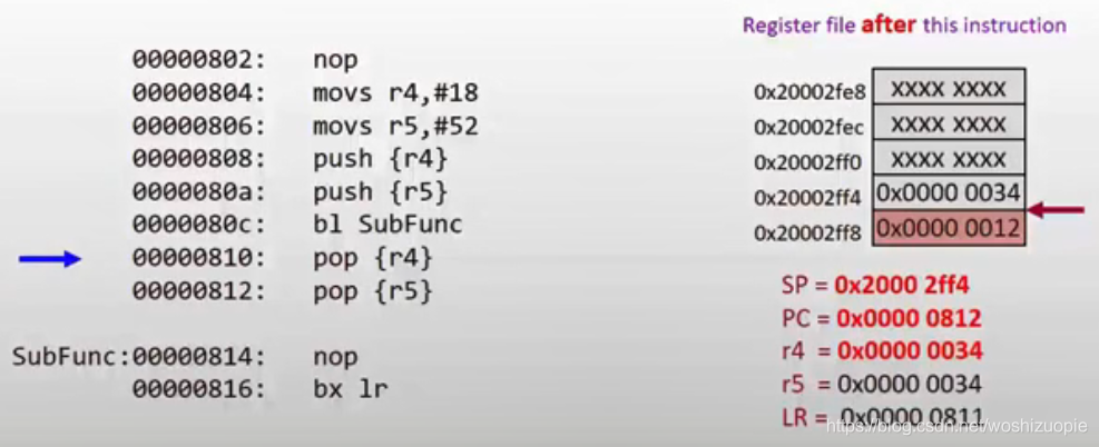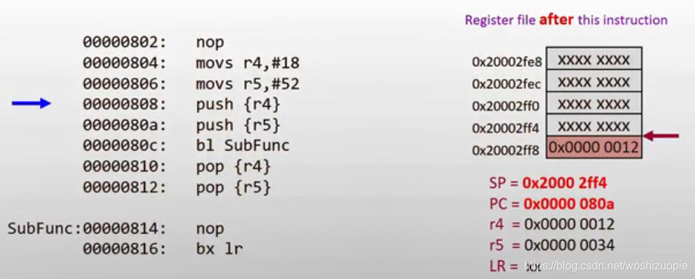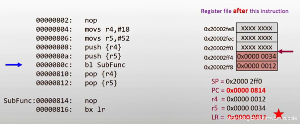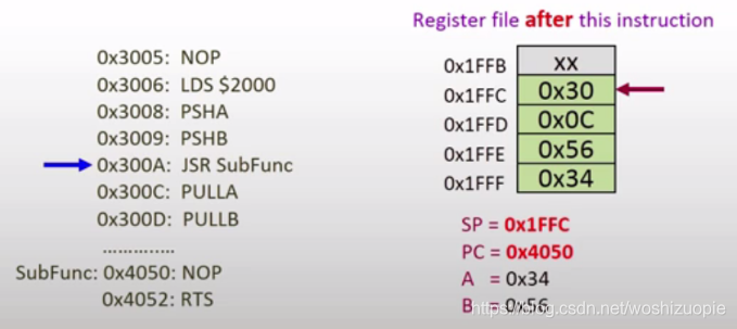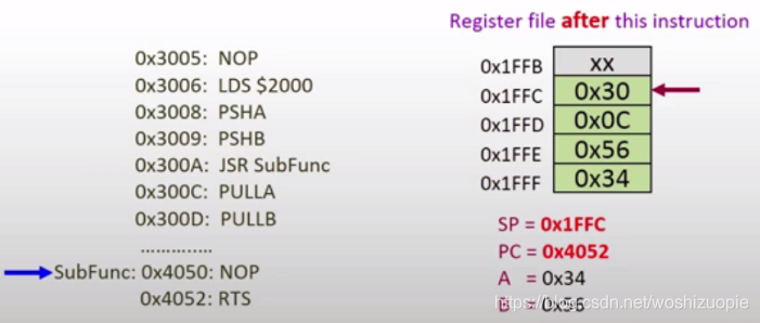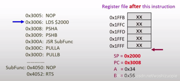 (5)调用子函数。蓝色箭头执行完后,PC指向子函数的第一条指令,堆栈中多出2bit的内容(0x30和0x0C),这两个字节合起来是一个16bit的完整地址0x300C,对应调用函数指令的下一条指令(即函数返回后,继续执行下一条指令,这是一个自动的压栈过程),SP指向0x1FFC。