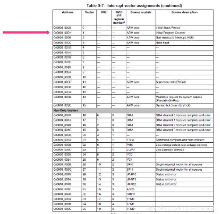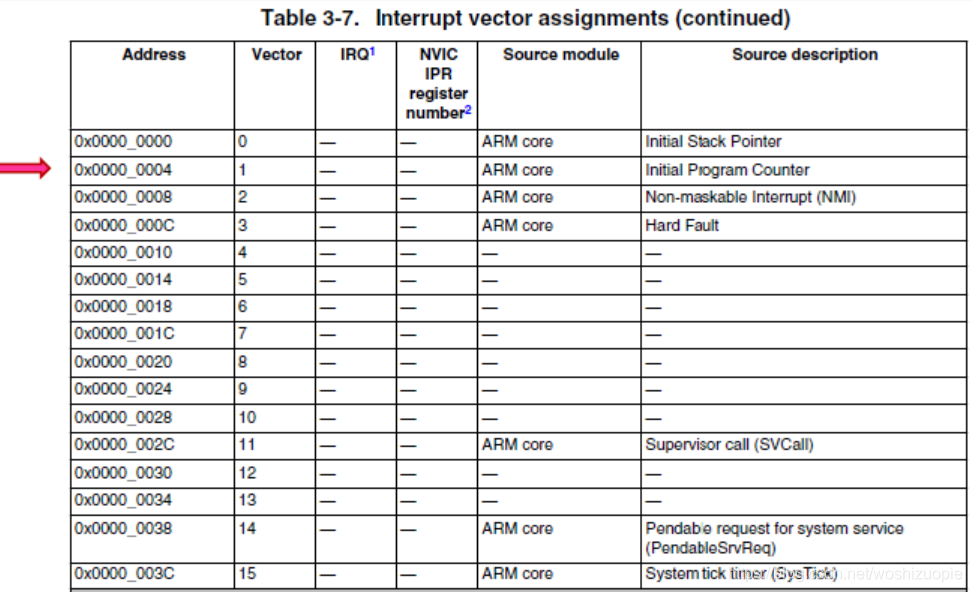 从表中得知,第二个是reset,即复位的中断向量。在这个表项里存储的函数的入口地址,是该芯片复位以后所取回的第一条指令的执行地址(通俗一点就是,芯片一旦完成复位,CPU会自动从这个位置取一个地址,赋给PC指针,跳转到那里,从第一条指令开始执行)。那么,这个地址填谁呢?在绝大多数嵌入式系统中,开发工具会帮你生成一段startup code(一小段入口函数),这个地址就填该函数的第一条指令的地址。而这个入口函数的最后一句一般就是jump到main函数。