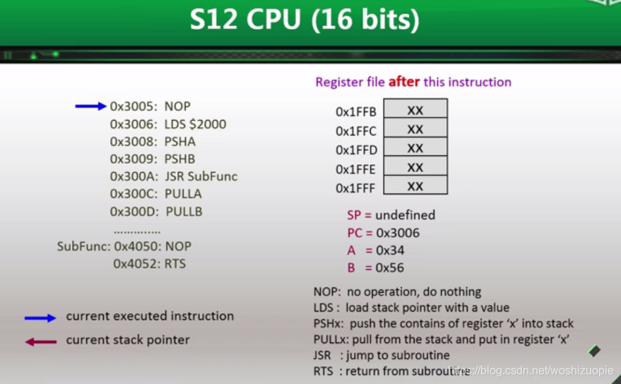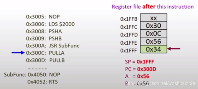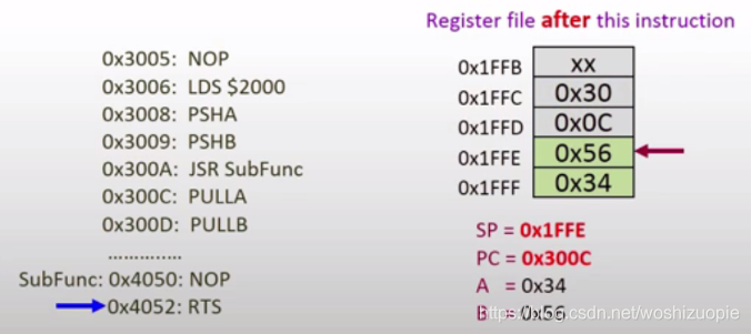 (7)RTS表示从子函数返回,PC变成0x300C,从哪里来的呢?堆栈指针寄存器往下移了两位(释放了两个单元),把0x30和0x0C取出来赋给了PC,即子函数执行完后返回的地址。(注意:30和0C两个值还在内存里,只是不再被堆栈所使用了,下次再往这个地址放值的时候回直接覆盖掉之前的。)