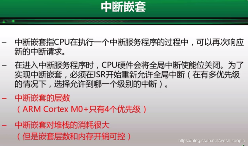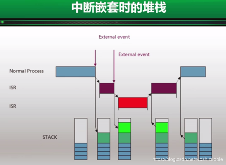 新发生的中断如果没正在执行的中断的优先级高,就会继续执行完现在的中断,再执行新的中断;如果新中断比正在执行的中断的优先级高,那么就会打断当前的中断,跳转到一个新的中断里。如下图所示,