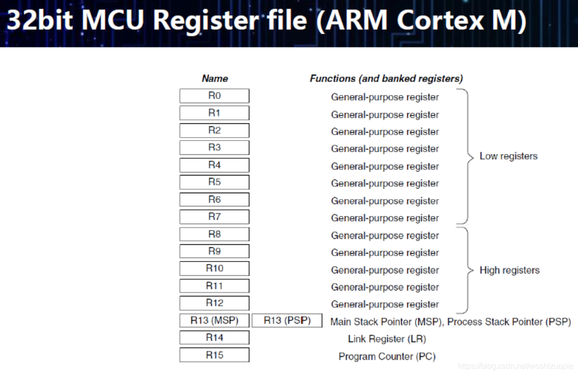 从寄存器上看,在数据和地址的通用寄存器上,ARM Cortex M的内核基本都是上图所示的寄存器组:包括R0 ~ R15共计16个32bit的寄存器。其中,R0~R12为通用寄存器,R13规定为堆栈指针寄存器,它总是保存一个地址(可以理解为一个指针),指向堆栈所使用的内存地址;R15是PC指针寄存器,它也保存一个地址,就是程序运行到第几条指令的那个指令的地址;R14(Link register),它是在发生函数调用、程序跳转的时候,自动保存一个函数的返回地址。(最早的CPU,返回地址是保存在寄存器内,后来函数的调用、嵌套越来越多,才开始使用堆栈。使用Link Register的话,可以使程序在发生单次调用的时候,使它的跳转和调用变快很多。)