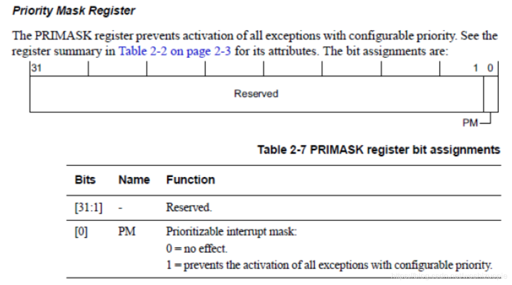 PRIMASK ,优先级mask寄存器。这里只使用最低的1位,这1位不是根据优先级控制中断,而是控制了所有中断的使能和关闭。所以它是控制中断的总开关。