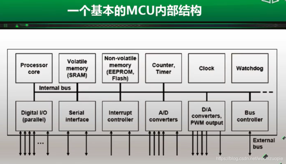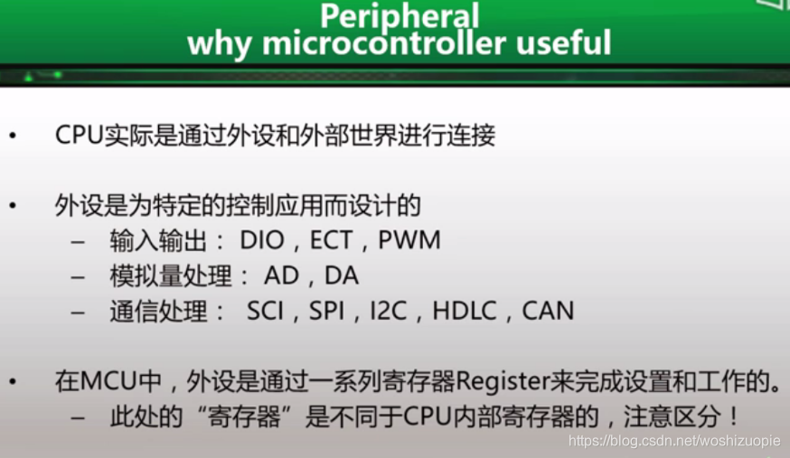 外设寄存器组:外设的操作都是在这一块进行的。对于CPU来讲,仍然是通过地址对这些寄存器进行0和1的读写来完成对外设电路的控制。