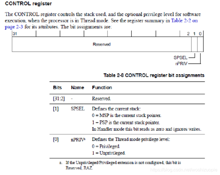 CONTROL Register:CPU的状态寄存器,有2个bit可以使用。bit0控制CPU工作在用户态还是特权态(在M0和M0+的CPU上,这两种状态是不加以区分的,所以是Reserved;M3和M4是区分的),bit1规定了所使用的堆栈是主堆栈还是进程堆栈。