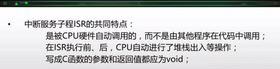 ③ 因为它不被主程序流程调用,它也不必向任何程序传递返回值,所以它必然是一个void类型、void返回值的特殊函数。