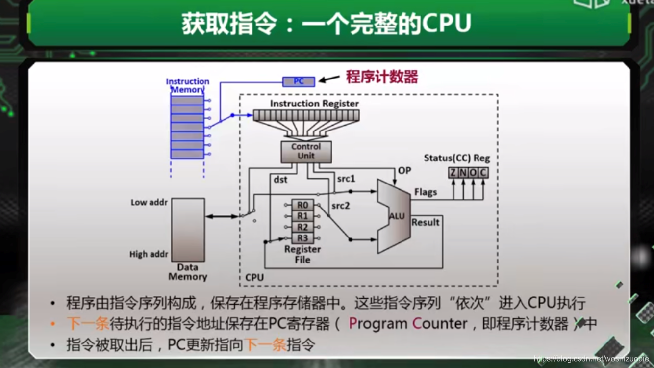 所谓程序,就是指令的集合,而每一个指令又是0和1组成的机器码放在存储器中。在时序电路的驱动下,依次把存储器中的指令读取出来放在控制单元中。在这个过程中,会有一个PC寄存器(也叫程序计数器)参与进来,也叫PC指针寄存器,因为这个寄存器一直保存下一条将要执行的指令的地址。总而言之,它是一个指针。