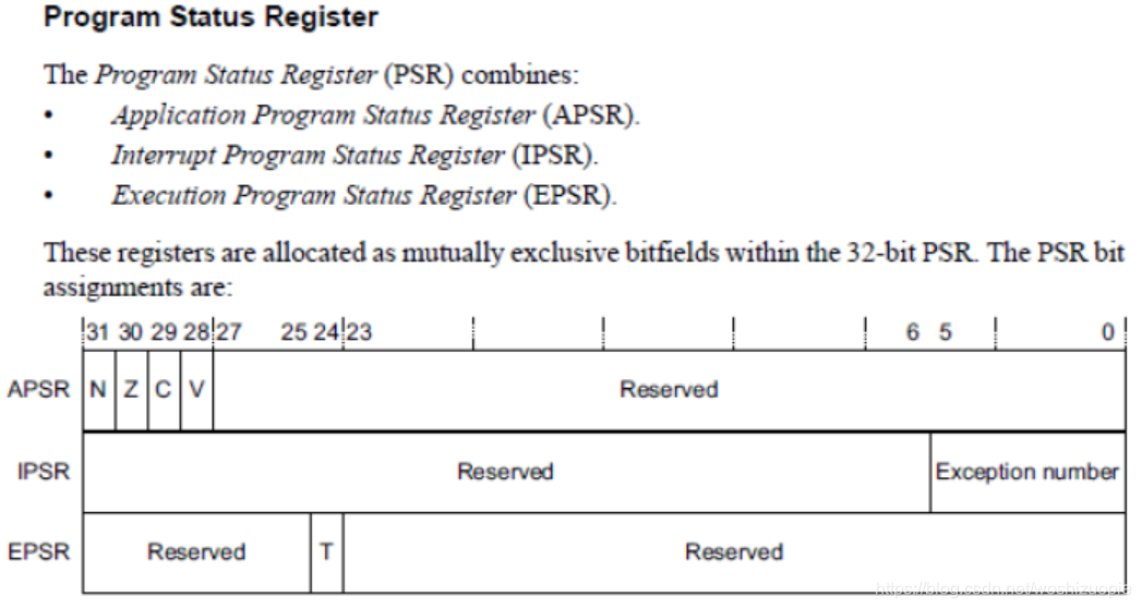 xPSR是一个32bit的状态寄存器,每一个bit都有自己唯一的功能,便于我们对它进行访问,获得CPU的状态。它有三个别名,用别名访问寄存器的时候,只关注和读取其中特定的字段,来实现单一的功能。(比如用APSR这个名字访问这个寄存器,读到的是高4位的值,后面都是Reserved,高4位的值存的就是是否有得0、是否有负数、是否有借位进位、是否有溢出这样一些基本的指令运算产生的状态位。用IPSR时,高几位都是Reserved,Expection number保留了中断时候发生异常的中断号。EPSR的T主要用来记录是否发生异常、是否发生中断。)