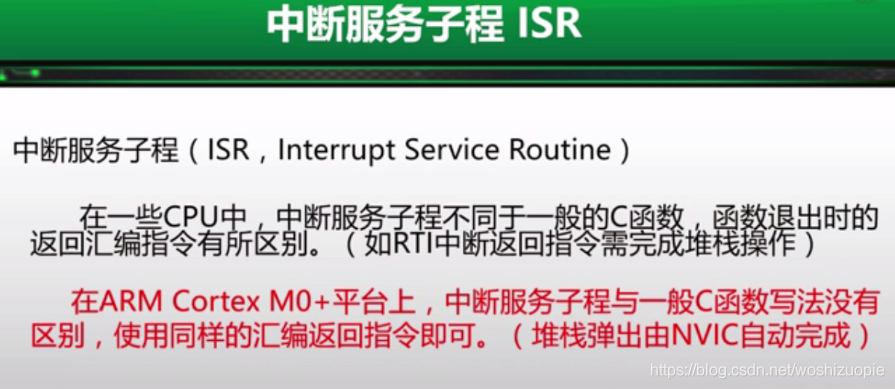 在ARM Cortex M平台上,中断服务子程与一般C函数写法没有区别,使用同样的汇编返回指令即可。(原因:ARM Cortex M处理器在发生中断的时候,会在LR寄存器R14里保存一个特殊值,从而在使用一个普通的函数返回指令时,CPU根据这个值知晓自己是一个中断返回。)