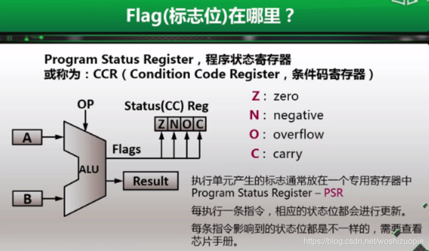 ALU产生的结果及状态位需要保存下来,大部分CPU会由register来完成,CPU中的这种register叫做程序状态寄存器(PSR,Program Status Register)或CCR。