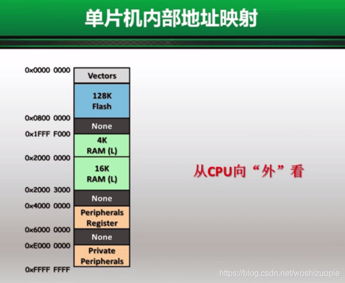 从CPU往外看,可以发现:从0x0000 0000开始到0x0800 0000这个地址段,是128K的Flash,最上边一小段是非易失的用来保存中断向量表。从0x1FFF F000开始到0x2000 3000是RAM,由4K和16K组成,这当中有一个None(或者叫Reserve),是空白地址。