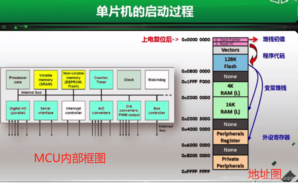 RAM:可以想象成它的上部是堆,存储全局变量,下部从底往上使用的话,可以是栈,方便进行函数的调用和中断时内存的开销、出栈/入栈;