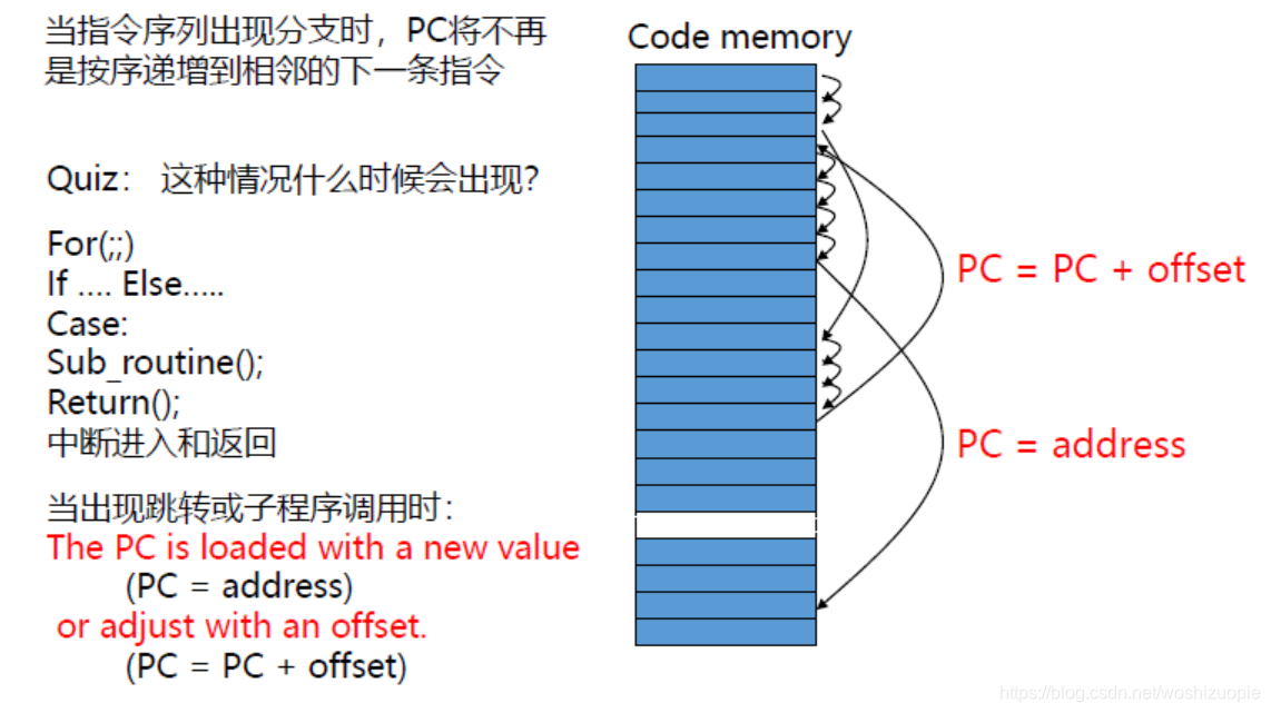 C语言翻译成汇编再翻译成指令,逐条执行下去。但是当指令序列出现分支时,PC将不再是按序递增到相邻的下一条指令。如下,offset--偏移量。