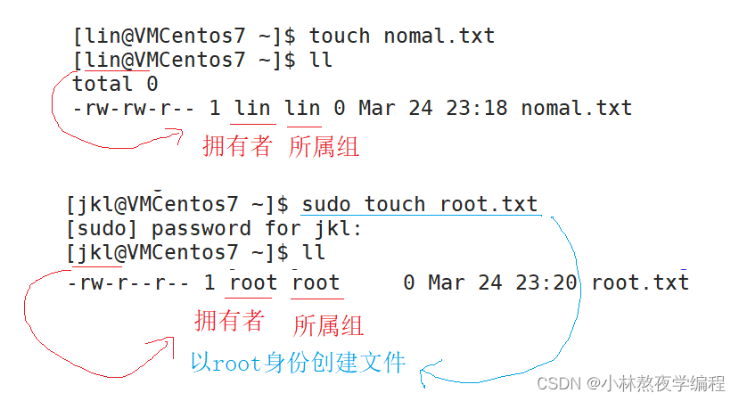 [lin@VMCentos7 ~]$ sudo touch root.txt # 不直接切换成root,但是以root的身份创建文件
