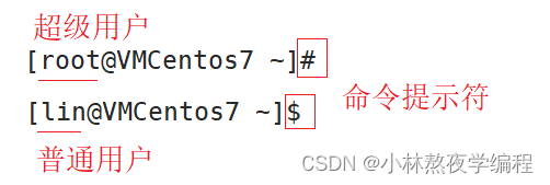 - 超级用户的命令提示符是“#”,普通用户的命令提示符是“$”。