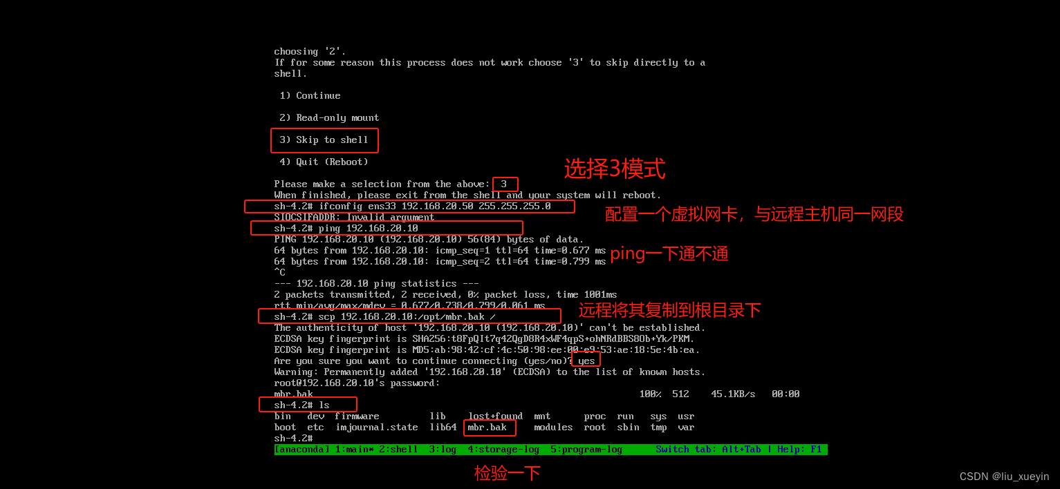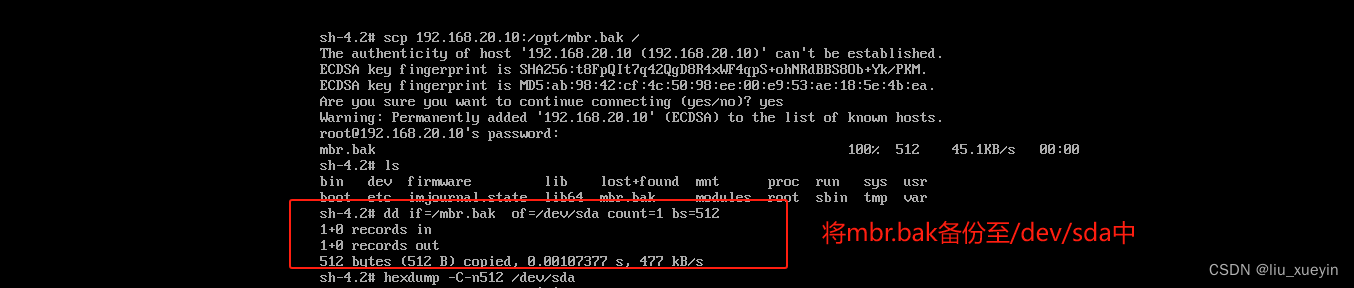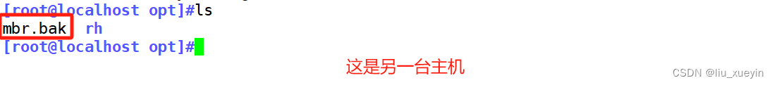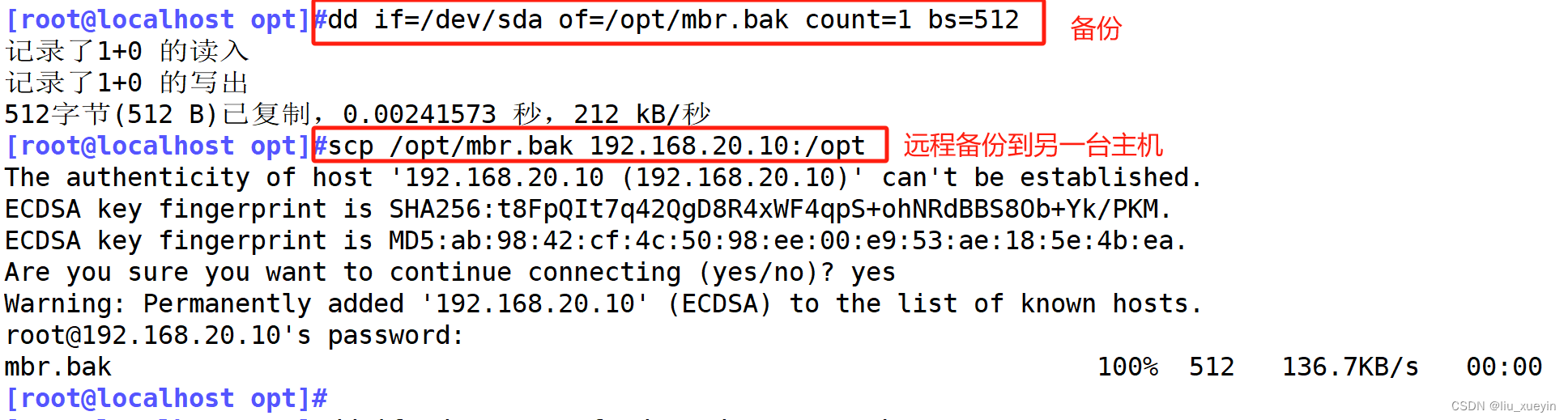 [root@localhost opt]#scp /opt/mbr.bak 192.168.20.10:/opt