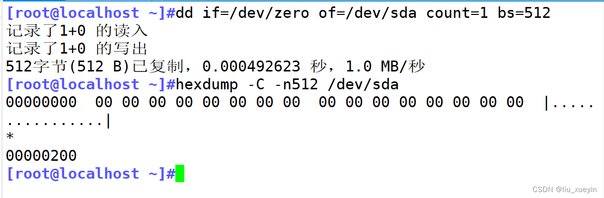 [root@localhost opt]#dd if=/dev/zero of=/dev/sda count=1 bs=512