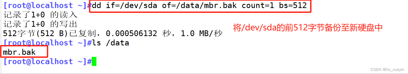 [root@localhost opt]#dd if=/dev/sda of=/opt/mbr.bak count=1 bs=512